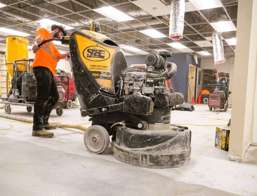 In many instances, walk-behind polishers are the only option. We offer both wet and dry grinding, as well as electric or propane options with these machines. These are best suited for office/retail buildings and upfit projects. Walk-behind polishers provide flexibility and precision, making them ideal for detailed work and smaller areas that require a high level of finish. This method allows for greater control over the grinding and polishing process, ensuring that every inch of the floor meets the standards of quality.
