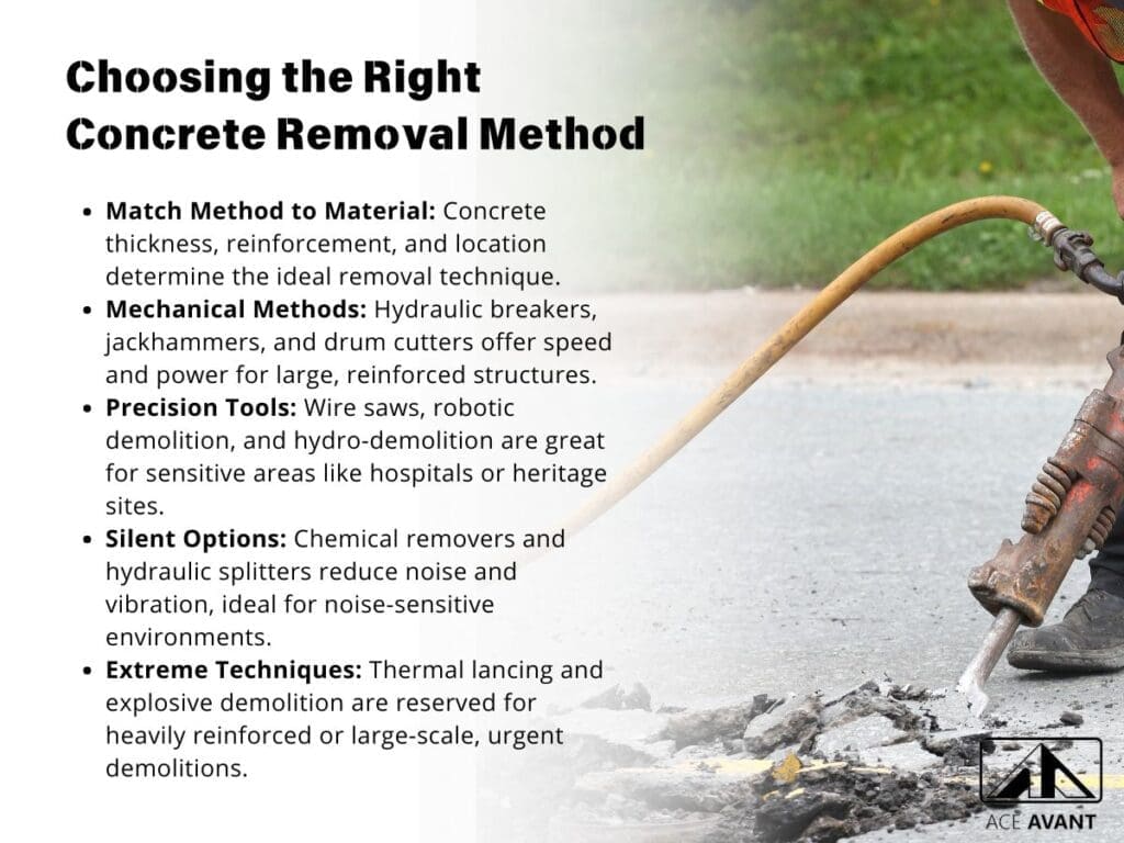 Concrete removal isn’t just about tearing down, it’s about building smartly from the ground up. By combining proper planning, the right tools, and a strong safety culture, you can transform demolition from a messy afterthought into a strategic advantage.