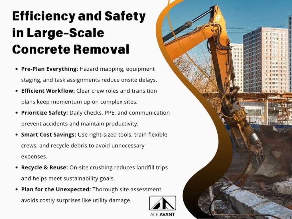Efficient debris handling is key to staying on schedule. First, separate metal and rebar from crushed concrete. Many firms now use on-site crushers to turn old slabs into reusable gravel—reducing trips to the landfill and keeping material costs low.