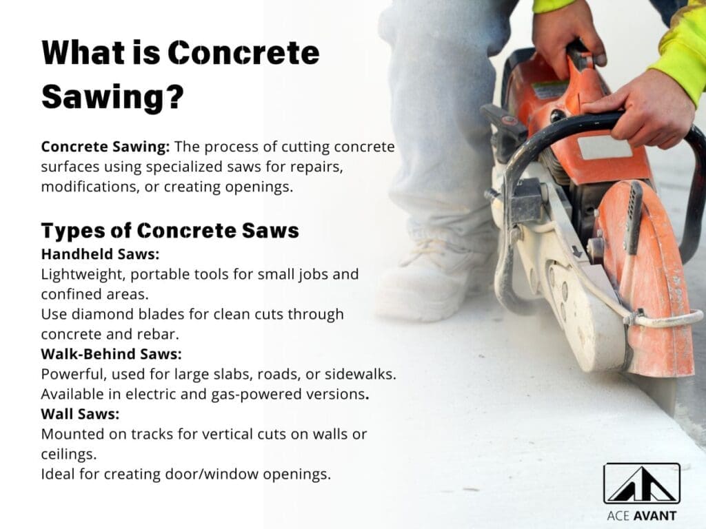 - Wall Saws: Wall Saws: Wall sawing is used when you need to cut vertical surfaces, such as walls, ceilings, or steep inclines. These saws are mounted on tracks, allowing for straight and level cuts through the material. Wall sawing is often employed to create openings for doors, windows, or mechanical systems in concrete structures.